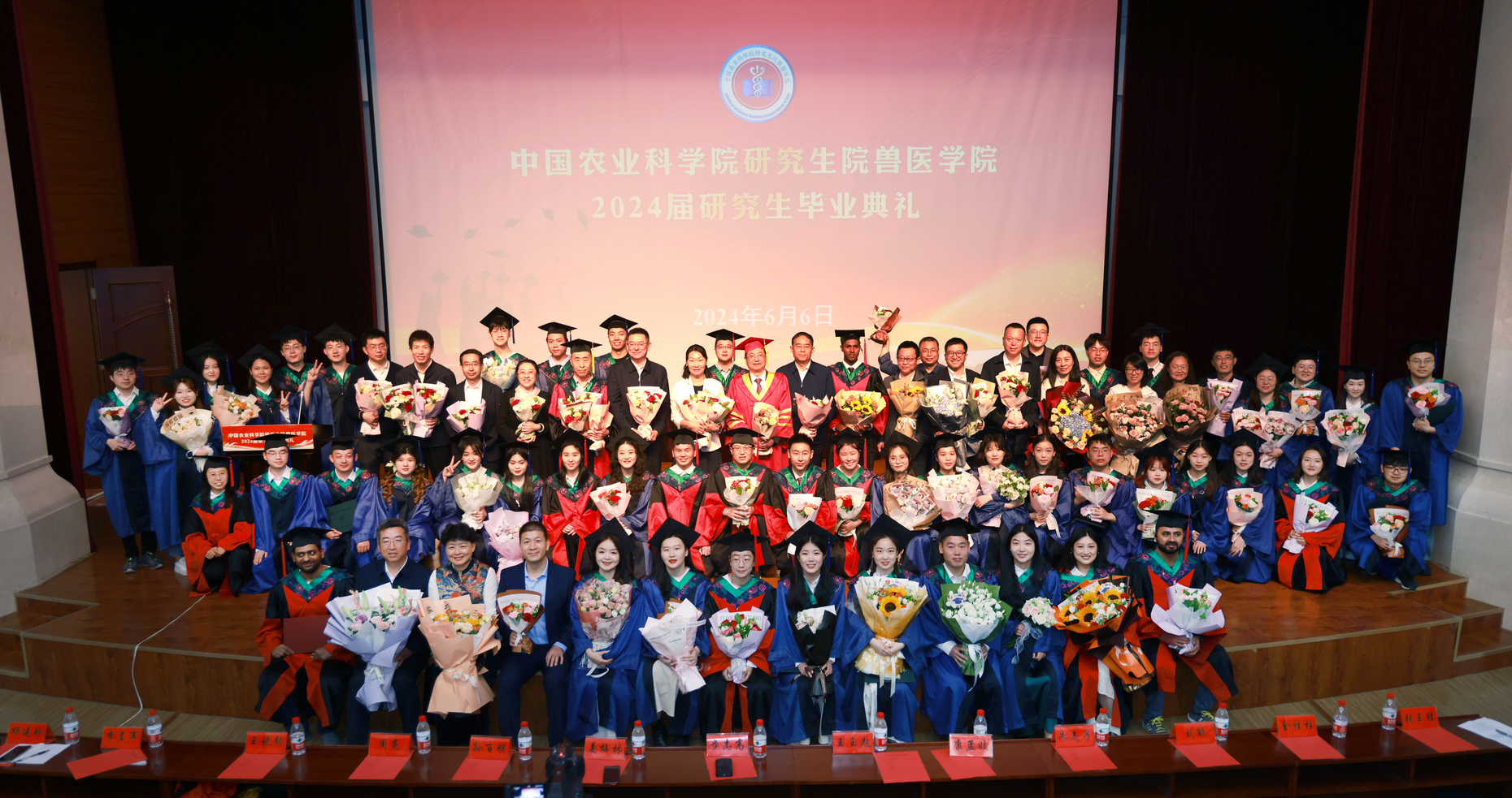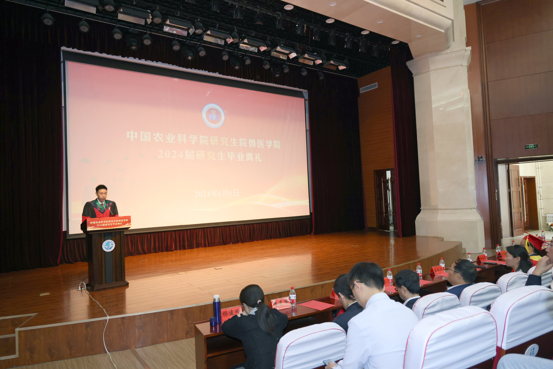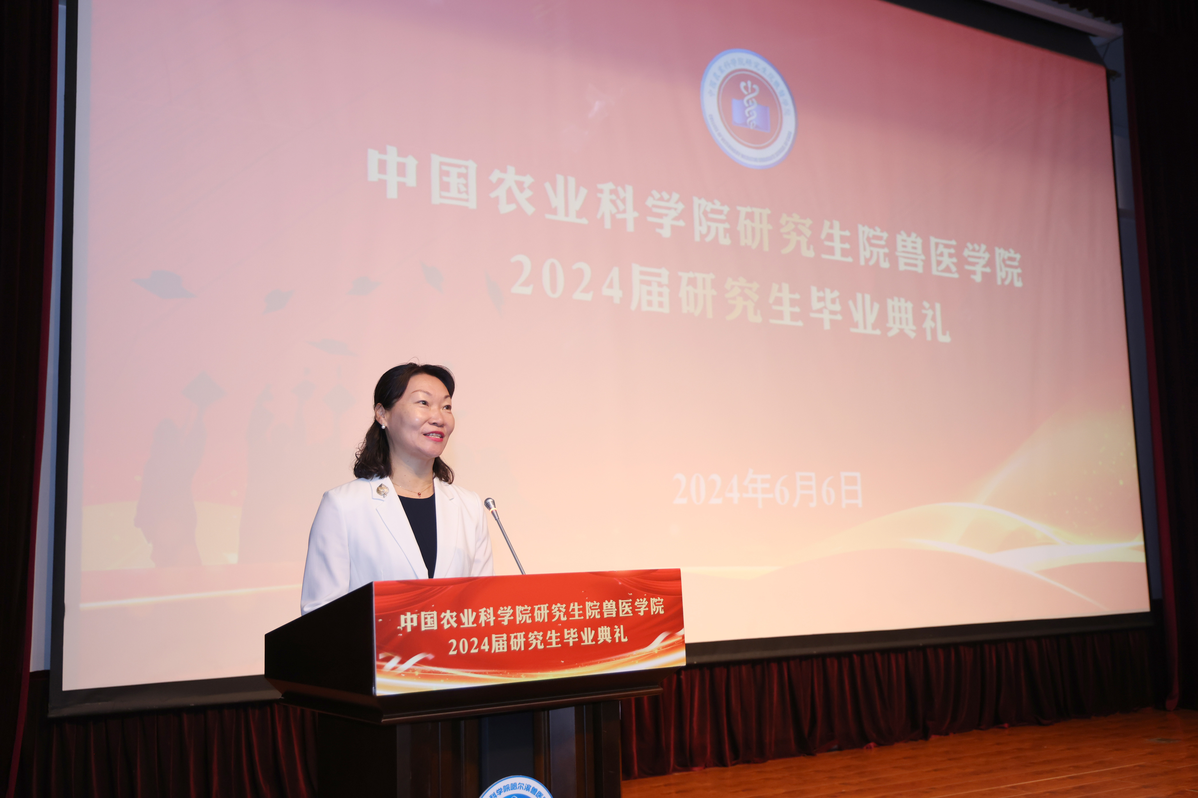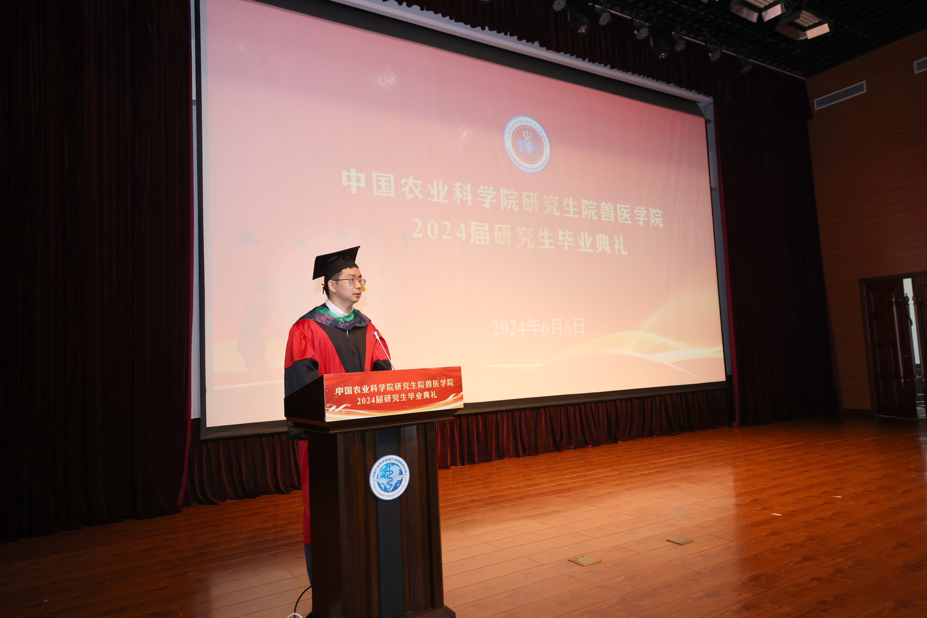 6月6日,中國農業(yè)科學院研究生院獸醫(yī)學院2024屆研究生畢業(yè)典禮在哈爾濱獸醫(yī)研究所綜合樓1058報告廳舉行。研究生院書記姜梅林,獸醫(yī)學院院長、哈獸研所長步志高,副所長孫百明,紀委書記周亮,副所長王曉鈞,副所長李呈軍,黨委委員、黨辦主任張曉鵬,黑龍江北大荒牧業(yè)集團有限公司董事長王玉起、副總經理金勝柱,廣東溫氏大華農生物科技有限公司副總裁康孟佼,北京金諾百泰生物技術公司經理劉鶴,哈爾濱東方基因生物制品有限公司總經理朱美子以及研究所職能部門負責人和創(chuàng)新團隊首席、班主任、導師、研究生300余人參加。畢業(yè)典禮由獸醫(yī)學院常務副院長劉益民主持。