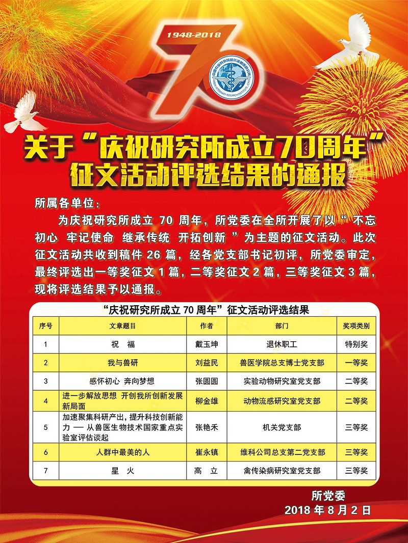 關(guān)于“慶祝研究所成立70周年”征文活動評選結(jié)果的通報(bào)