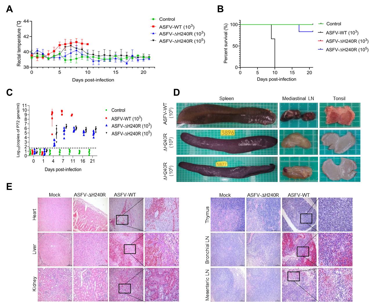 近日,中國農(nóng)業(yè)科學(xué)院哈爾濱獸醫(yī)研究所在非洲豬瘟病毒(ASFV)致病機(jī)制研究方面取得新進(jìn)展。研究發(fā)現(xiàn),ASFV的H240R基因通過抑制宿主炎性因子產(chǎn)生影響ASFV致病力,缺失H240R基因顯著促進(jìn)ASFV誘導(dǎo)的炎性因子產(chǎn)生,致弱ASFV對SPF豬的致病力。相關(guān)研究結(jié)果于1月19日以“Deletion of African Swine Fever Virus (ASFV) H240R Gene Attenuates the Virulence of ASFV by Enhancing NLRP3-Mediated Inflammatory Responses”為題發(fā)表在《Journal of Virology》雜志上。