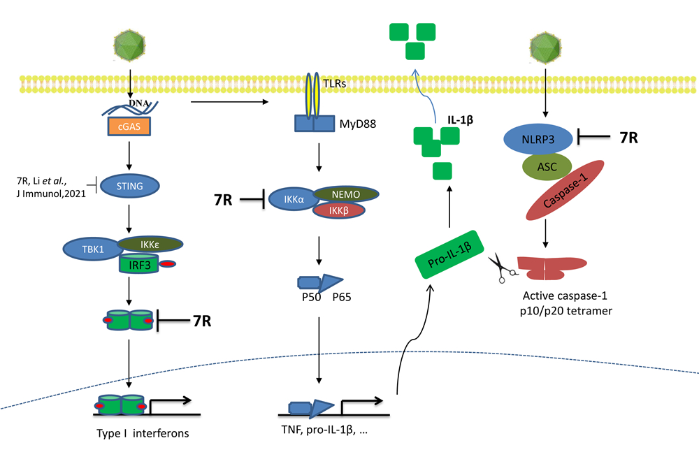 研究發(fā)現(xiàn),非洲豬瘟病毒感染原代豬肺泡巨噬細胞能抑制多種刺激誘導的IL-1β和IFN-β的升高,提示非洲豬瘟病毒編碼蛋白可能抑制IL-1β和IFN-β產(chǎn)生。通過篩選,研究人員發(fā)現(xiàn)非洲豬瘟病毒多基因家族(MGF)505/360多數(shù)成員對IL-1β和IFN-β產(chǎn)生具有抑制作用,其中pMGF505-7R的抑制作用最為顯著。敲除MGF505-7R基因的重組病毒能夠誘導更高水平的IL-1β和IFN-β的產(chǎn)生,表明pMGF505-7R對IL-1β和I型干擾素產(chǎn)生具有抑制作用。進一步研究發(fā)現(xiàn)pMGF505-7R通過與IKK復合物相互作用抑制IL-β基因的轉(zhuǎn)錄,并且其靶向NLRP3炎癥復合體抑制IL-β的分泌。而在I型IFN信號通路中,pMGF505-7R靶向IRF3抑制I型IFN的產(chǎn)生。動物實驗結(jié)果表明,缺失MGF505-7R基因的重組非洲豬瘟病毒對仔豬的致病力降低,感染豬血清中IL-1β和IFN-β的蛋白水平升高,而組織器官病毒載量顯著降低。這些研究成果初步揭示了非洲豬瘟病毒的免疫逃逸的一種新策略,為非洲豬瘟病毒致病機制探索和疫苗的研發(fā)提供了新的理論依據(jù)。