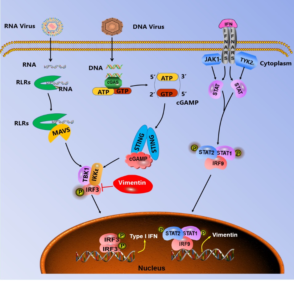該研究發(fā)現(xiàn)多種病毒感染促進(jìn)波形蛋白的表達(dá),且波形蛋白的上調(diào)表達(dá)依賴于IFNAR1,揭示波形蛋白是一種新型干擾素刺激基因。干擾素刺激產(chǎn)生的波形蛋白與干擾素信號(hào)通路中關(guān)鍵激酶 TBK1 和 IKKε 相互作用以破壞 TBK1- IKKε-IRF3復(fù)合物的形成,從而抑制 IRF3 的磷酸化和核轉(zhuǎn)位,最終抑制I 型干擾素產(chǎn)生,促進(jìn)病毒復(fù)制。該研究結(jié)果首次證明波形蛋白是一種新的干擾素刺激基因,并闡明了波形蛋白通過抑制I 型干擾素產(chǎn)生促進(jìn)DNA病毒和RNA病毒復(fù)制的新機(jī)制,在新型抗病毒藥物設(shè)計(jì)方面具有重要的指導(dǎo)意義。