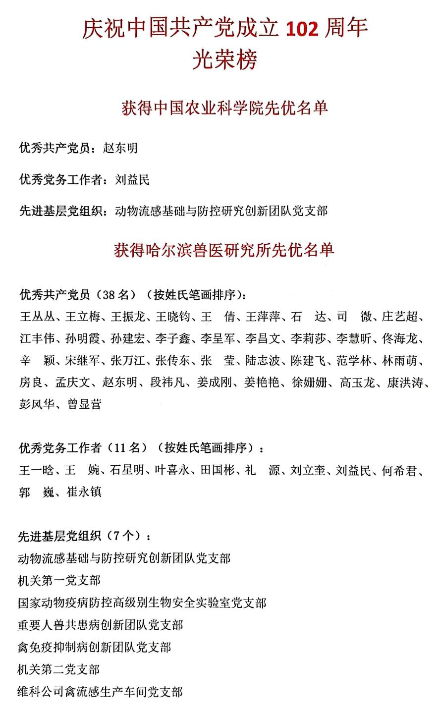 6月30日,中國農(nóng)業(yè)科學(xué)院哈爾濱獸醫(yī)研究所舉辦慶祝中國共產(chǎn)黨成立102周年主題活動,表彰2021-2022年度涌現(xiàn)出來的先進(jìn)基層黨組織、優(yōu)秀共產(chǎn)黨員和優(yōu)秀黨務(wù)工作者,舉行新黨員宣誓和重溫入黨誓詞活動,作主題教育專題黨課。中國農(nóng)科院主題教育第十巡回指導(dǎo)組組長劉繼芳、副組長鄧祥,指導(dǎo)組成員楊勇、殷娟出席活動。所長步志高,黨委副書記夏長友,副所長劉勝旺、孫百明,黨委委員張曉鵬,全體黨員干部400余人參加會議,紀(jì)委書記周亮主持會議。