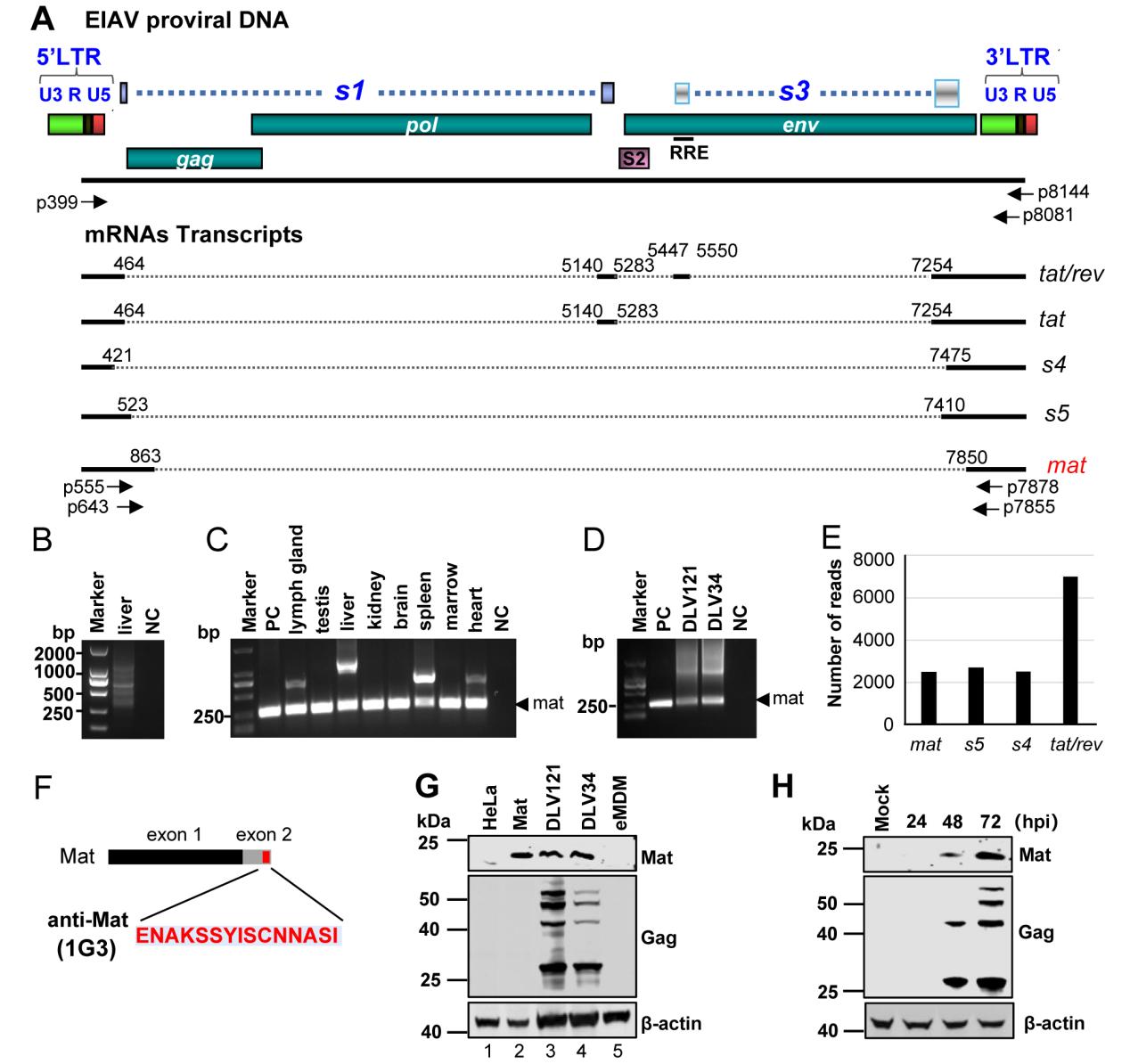 馬傳染性貧血病毒(EIAV)與人免疫缺陷病毒(HIV-1)同屬于逆轉(zhuǎn)錄病毒科慢病毒屬的成員。慢病毒是一類基因組結(jié)構(gòu)較為復(fù)雜的反轉(zhuǎn)錄病毒,其基因組除了編碼反轉(zhuǎn)錄病毒共有的3個結(jié)構(gòu)蛋白(Gag、Pol和Env)外,還編碼3-6個不等的附屬蛋白。前期研究認(rèn)為,EIAV是基因組結(jié)構(gòu)最簡單的慢病毒,只編碼3種附屬蛋白(Tat、S2和Rev),而HIV-1編碼6種附屬蛋白(Tat、Rev、Nef、Vpu、Vif、Vpr)。該研究從EIAV感染馬的組織中擴增到多種新的mRNA轉(zhuǎn)錄本,并證明了其中一種單剪接轉(zhuǎn)錄本可以編碼新的病毒蛋白Mat。