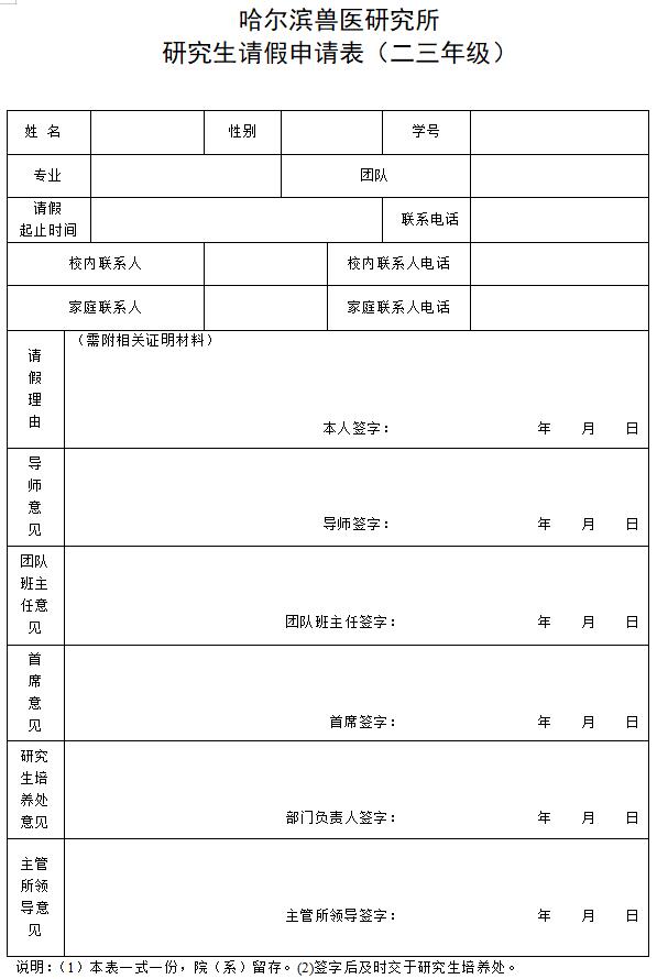 哈爾濱獸醫(yī)研究所研究生請(qǐng)假申請(qǐng)表(二三年級(jí))如下,