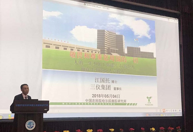 2018年5月4日,應哈爾濱獸醫(yī)研究所王笑梅書記之邀,大連三儀集團董事長江國托博士在我所《凌風講堂》做了“敬畏和尊重您周圍的一切”主題報告。本次講堂由劉勝旺副所長主持,步志高所長、王笑梅書記、創(chuàng)新團隊首席、科研人員以及博士、碩士研究生300余人參加了此次報告。